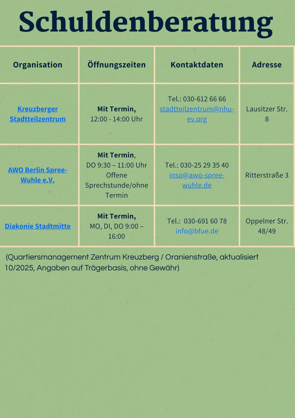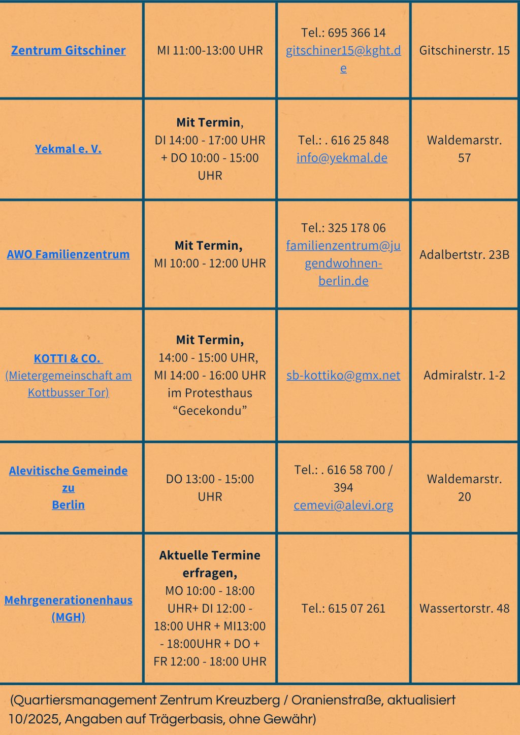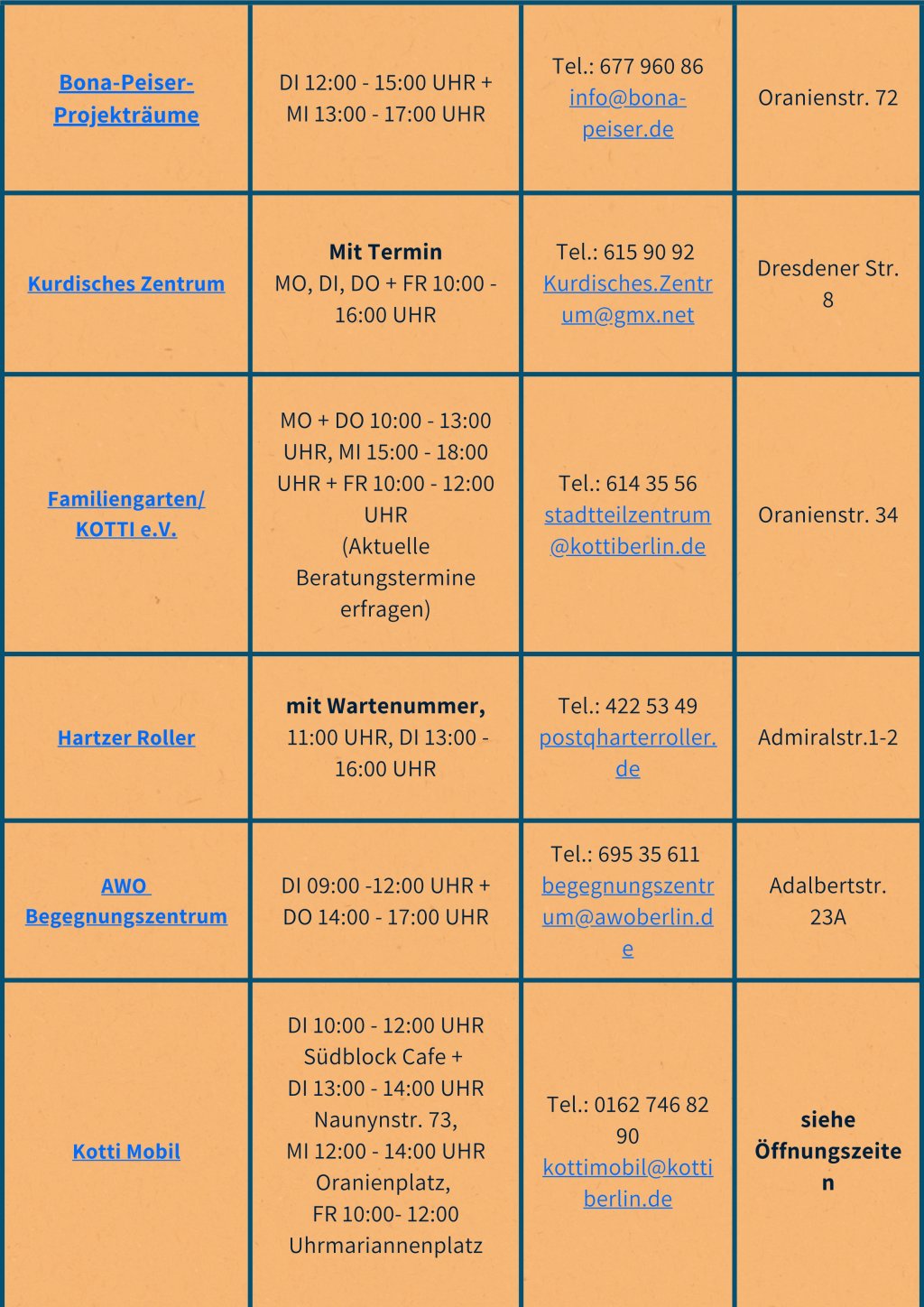 Bei Fragen zu den Angeboten und für Terminvereinbarungen wenden Sie sich bitte direkt an den jeweiligen Anbietenden.